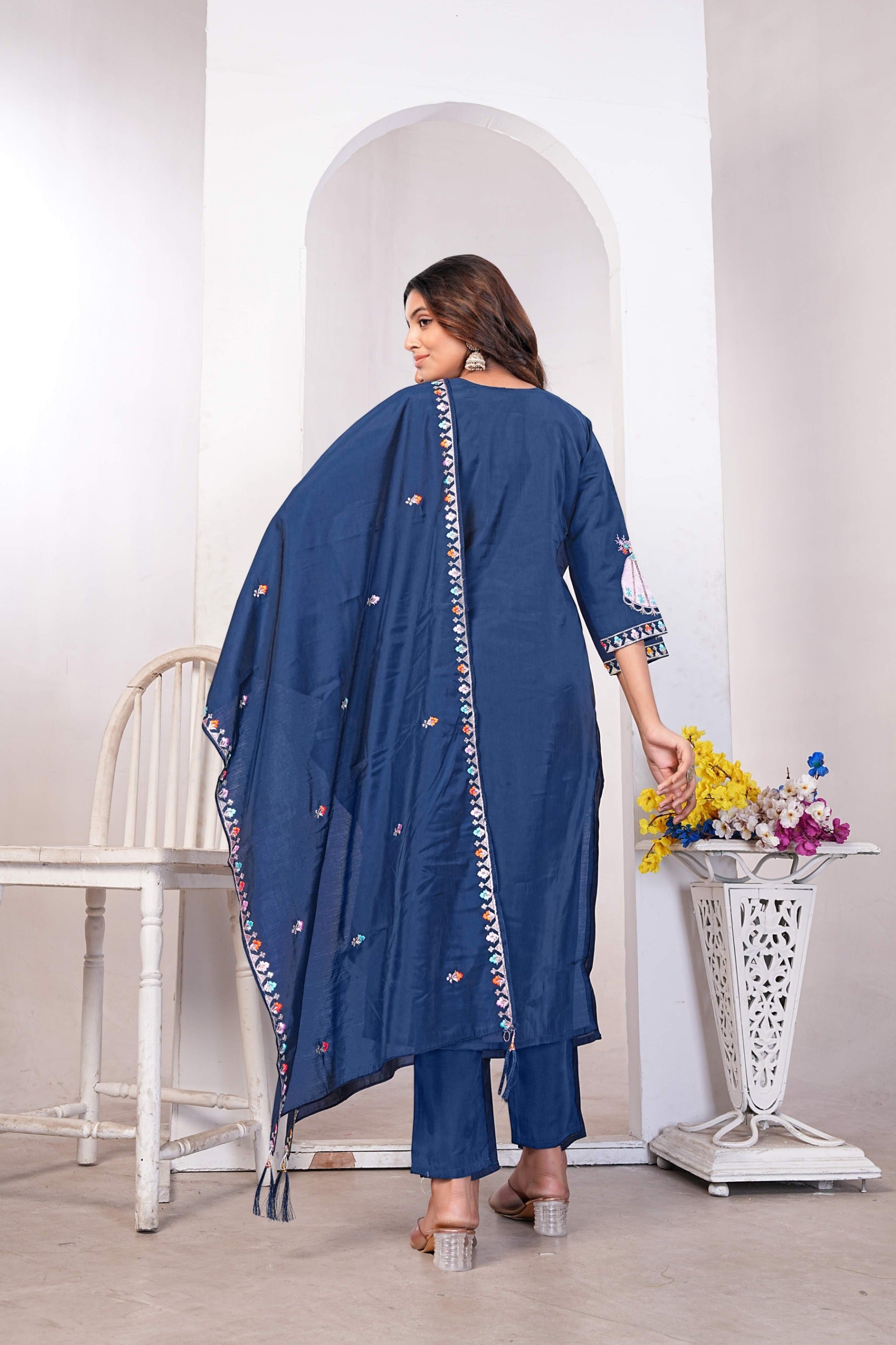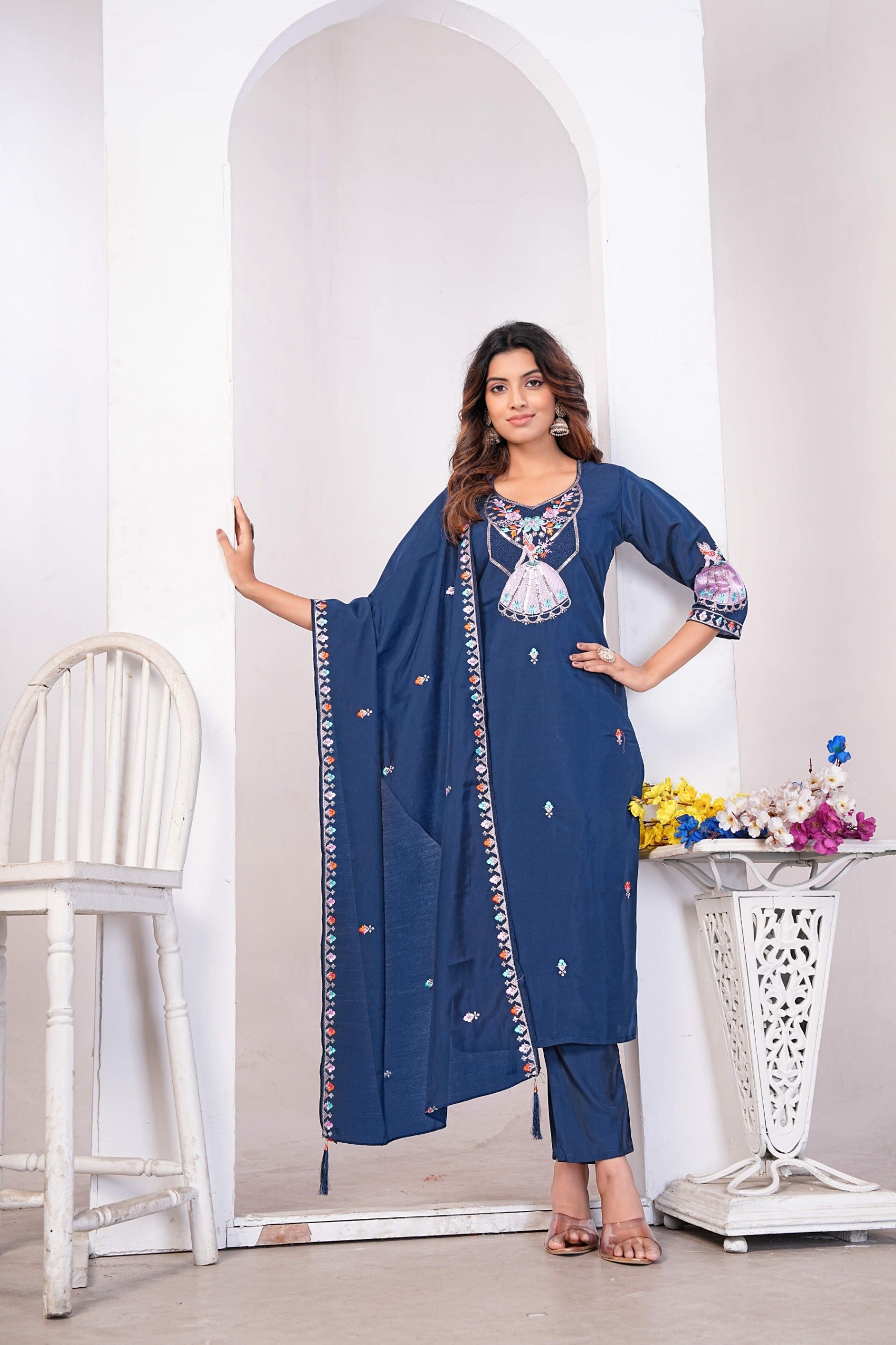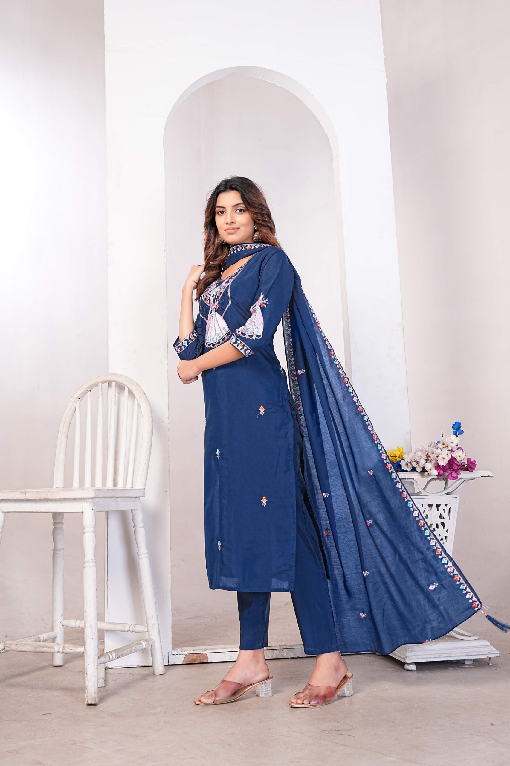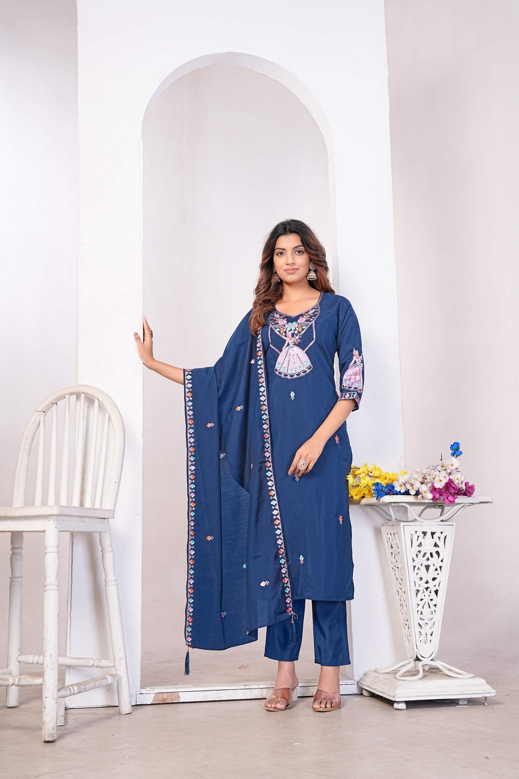 Elevate your ethnic wardrobe with this elegant navy blue kurti set, beautifully detailed with delicate multicolor embroidery. Designed for effortless grace and everyday comfort, this set includes a straight-cut kurti, matching pants, and a coordinated embroidered dupatta.